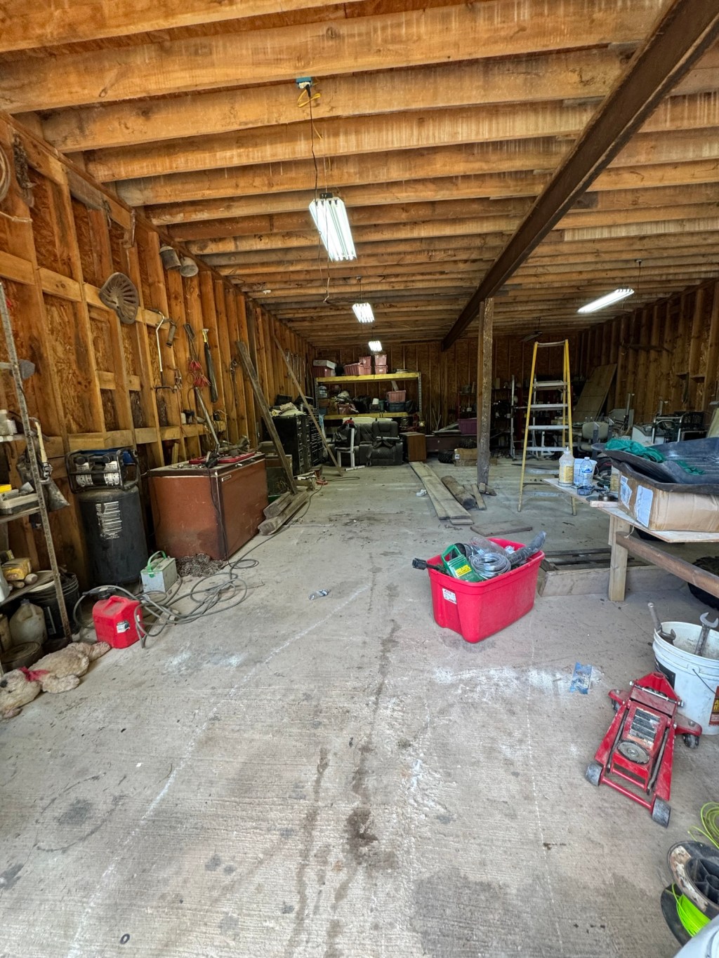 Hauled away junk, sorted boxes, and recycled scrap metal. Installed foldable squat racks and resistance band hooks to maximize space. Added shock-absorbing gym mats for safety and comfort. Sealed air leaks and added insulation to make it usable year-round.